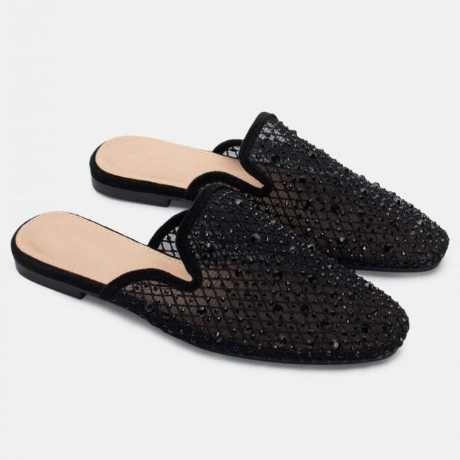 Babouche en noir avec détails en strass. Modèle à pointe ronde.
