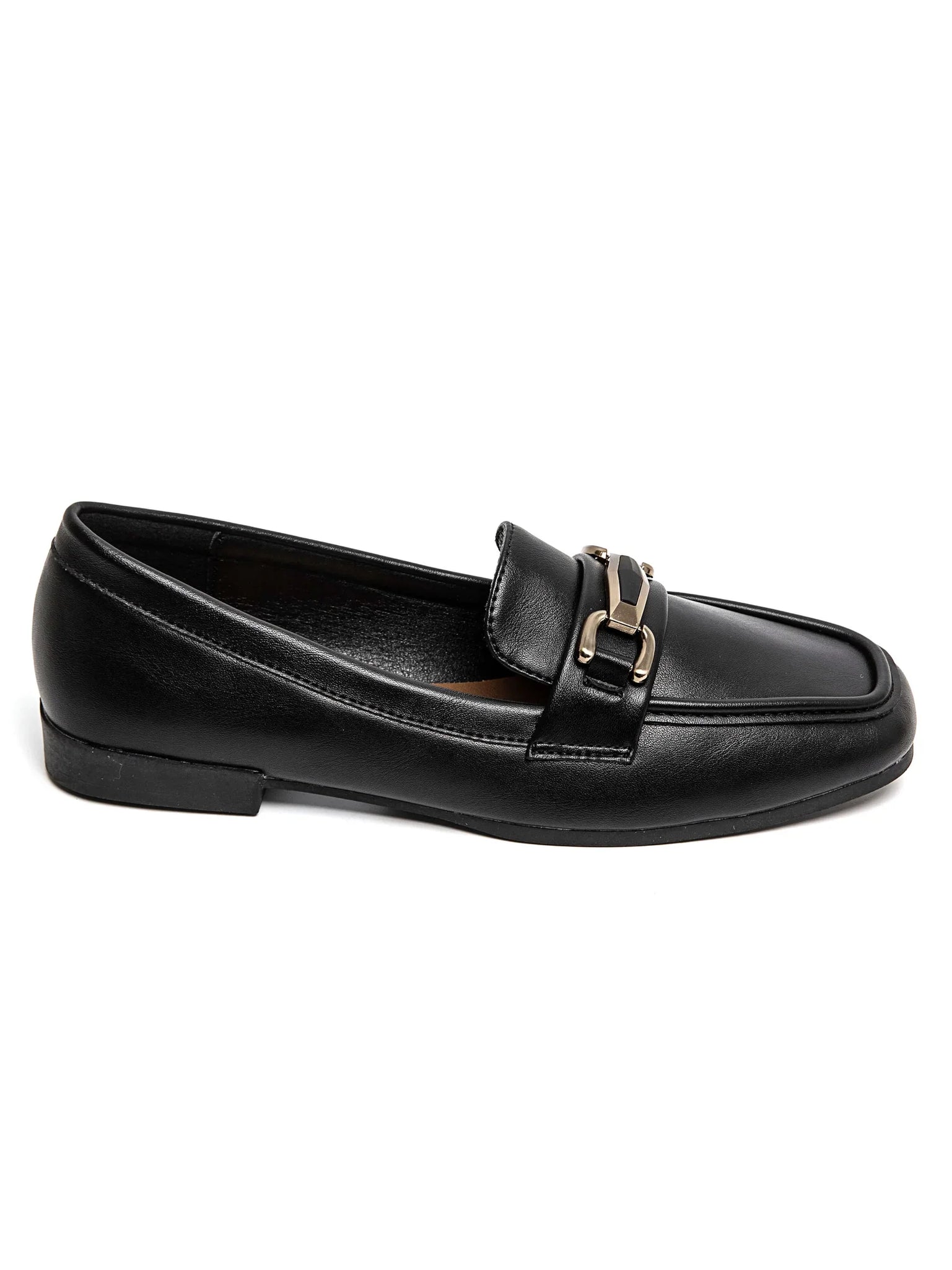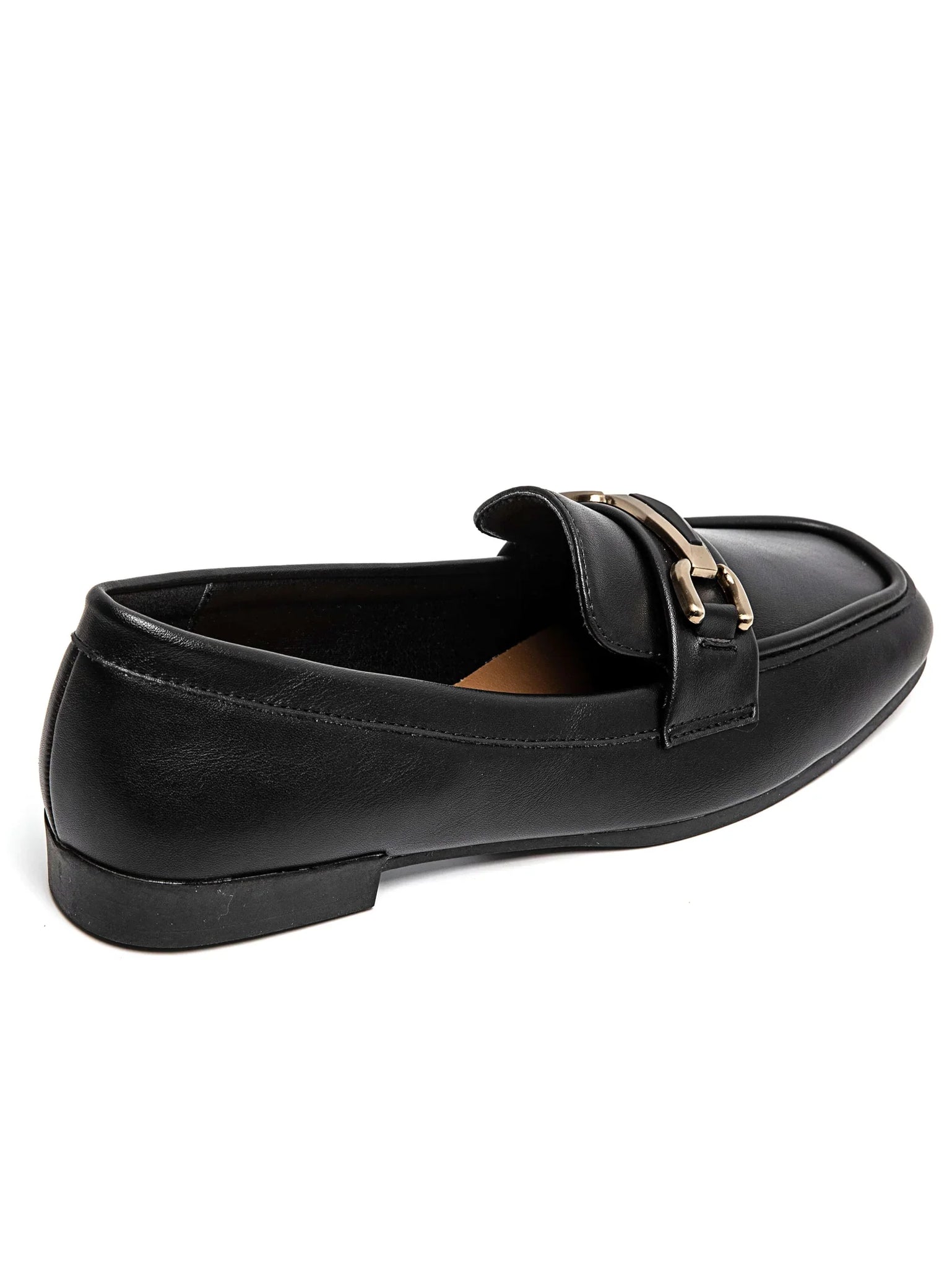 Mocassins élégants en simili cuir noir, ornés d’un détail métallique doré sur l’empeigne pour une touche raffinée. Leur design intemporel et leur semelle confortable en font un choix parfait pour un look chic au quotidien. Disponible également en beige.