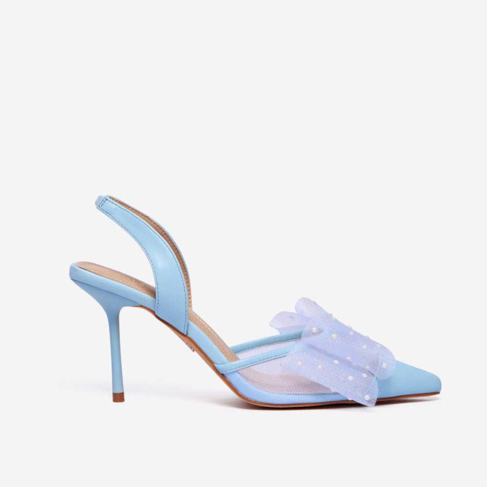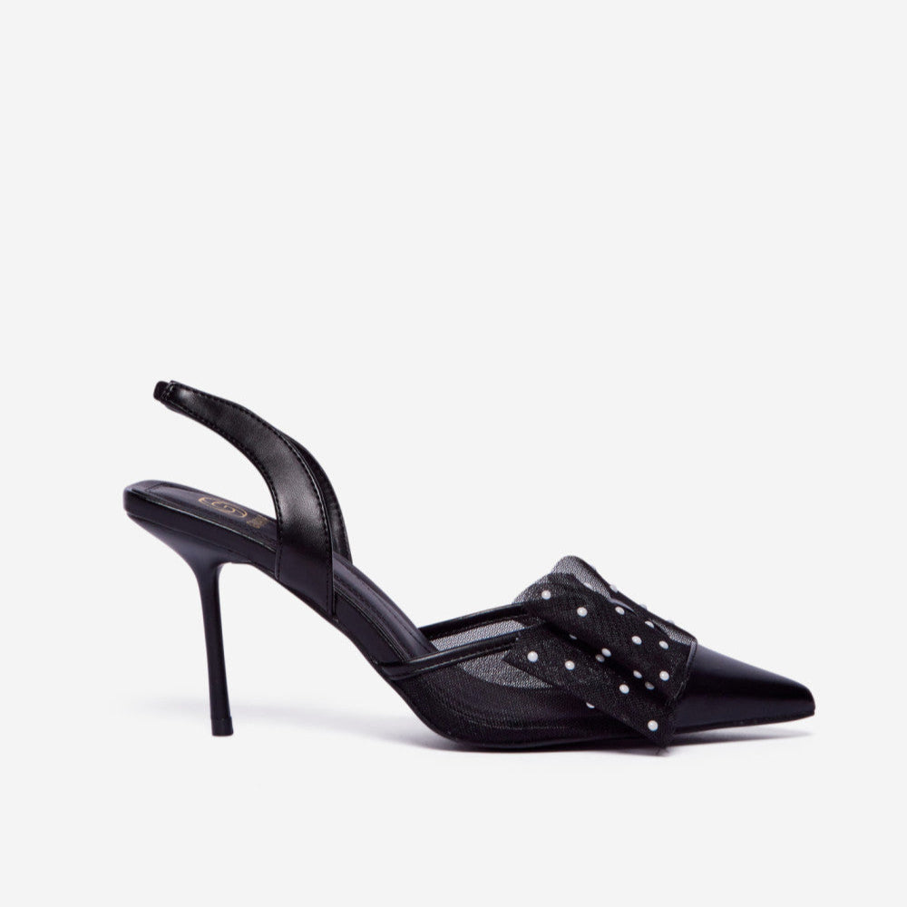 Affirmez votre style avec ces escarpins à bride arrière, ornés d'une élégante maille et d'un nœud oversize. Orné de pois blancs fantaisie, le nœud ajoute une touche glamour et féminine à la silhouette classique à bout pointu. Le talon aiguille fin allonge la jambe, tandis que la bride arrière réglable assure un confort optimal. Parfaits pour les soirées, les cocktails et les occasions spéciales, ces escarpins noirs en maille sont un choix unique et élégant pour les femmes à la pointe de la mode.