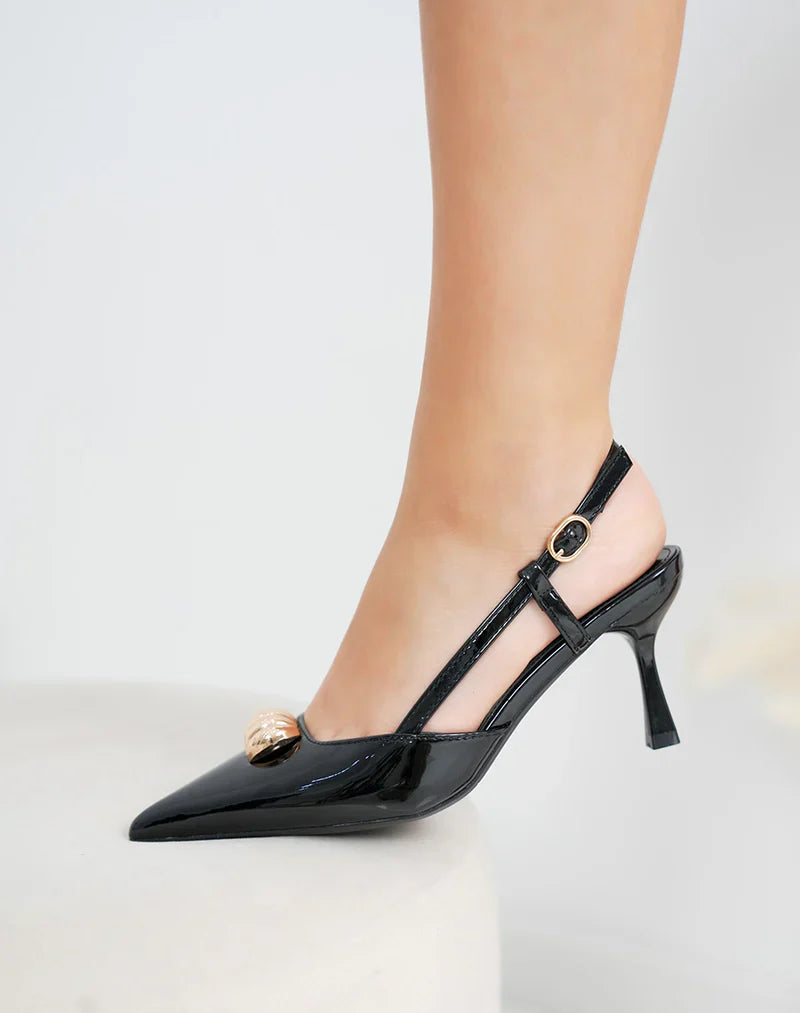 Escarpins à bout pointu et talon carré avec coquillage doré
