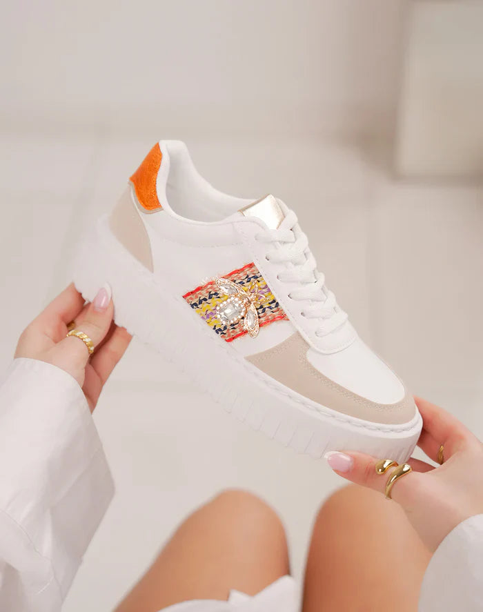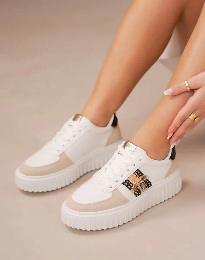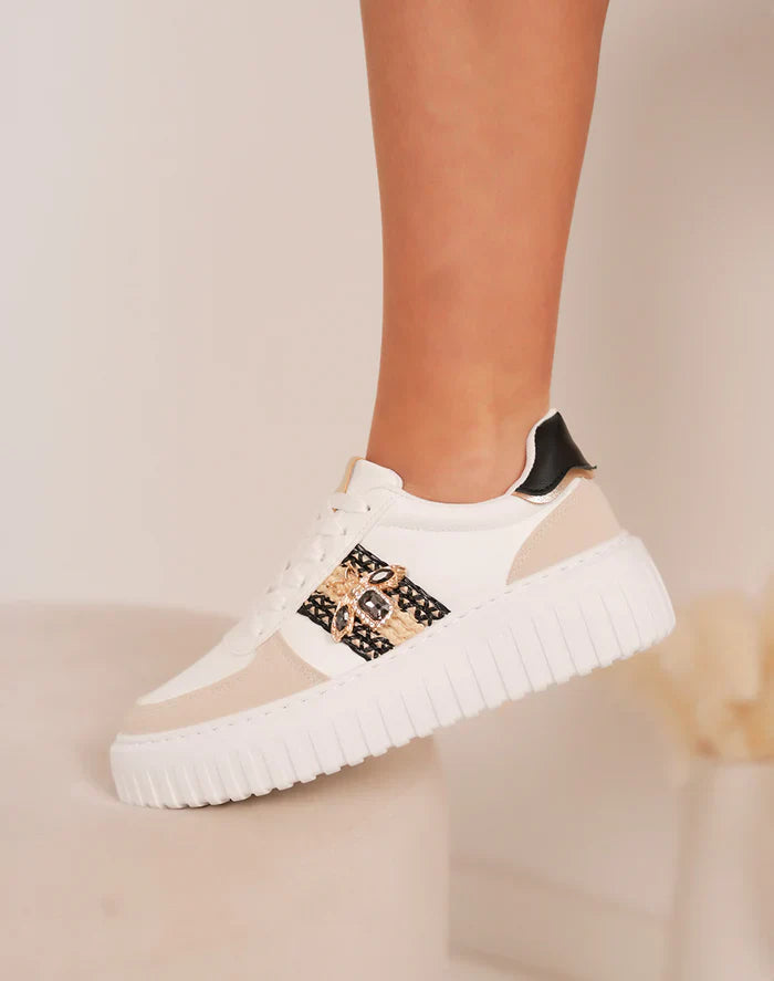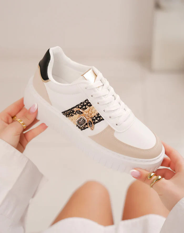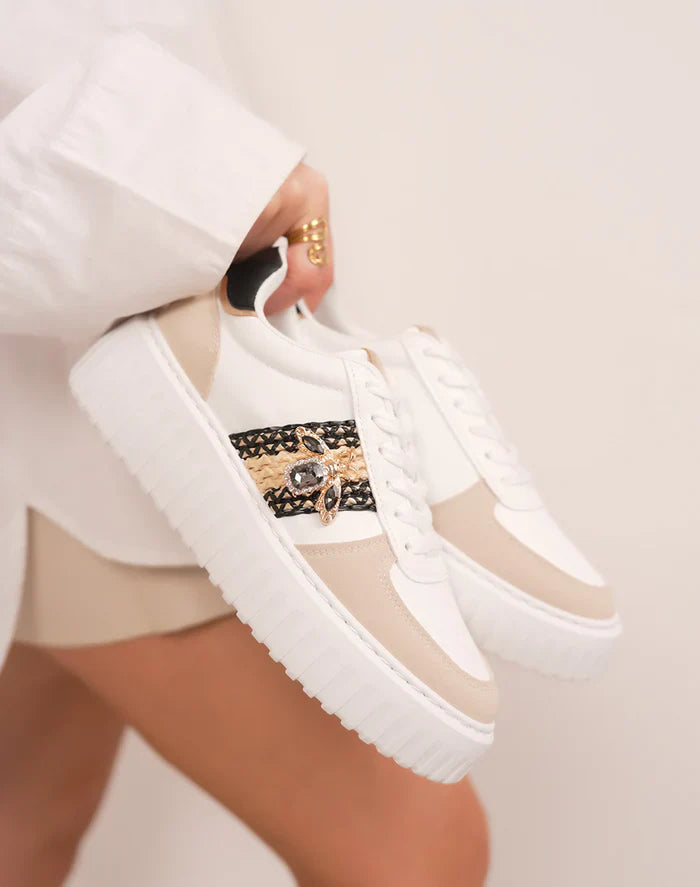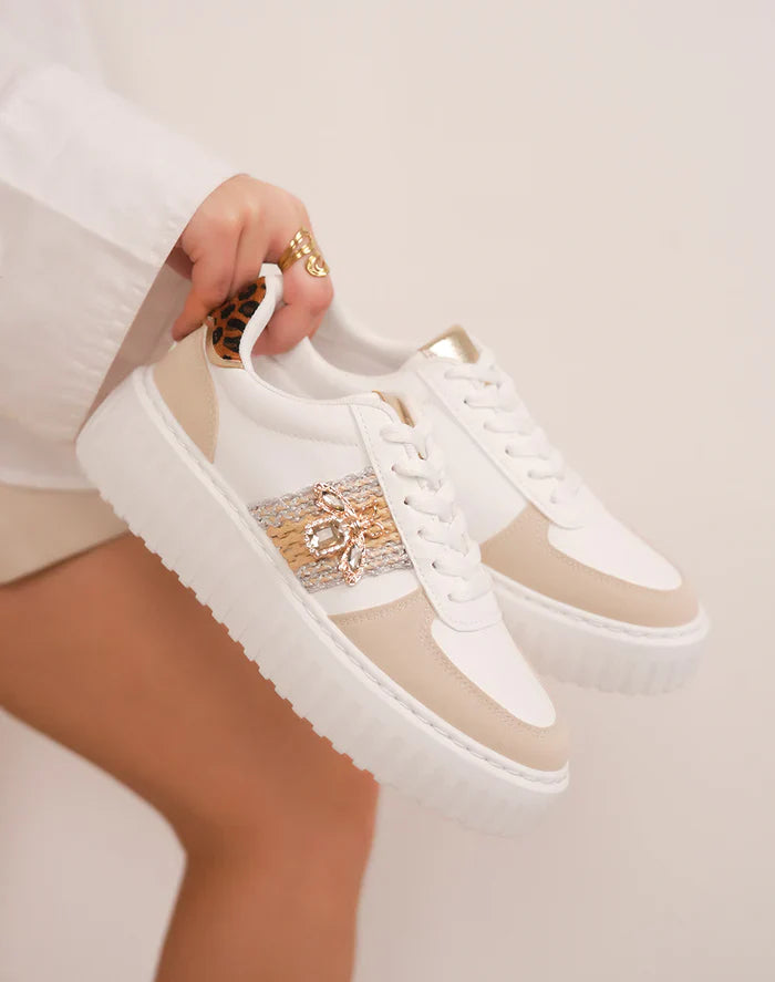 Craquez pour l’originalité avec ces baskets femme à plateforme, subtilement relevées par un empiècement en osier tressé, une touche de suédine beige et un bijou doré en forme d’abeille incrusté de strass. L’arrière du modèle présente un patch imprimé pour une touche sauvage et audacieuse.