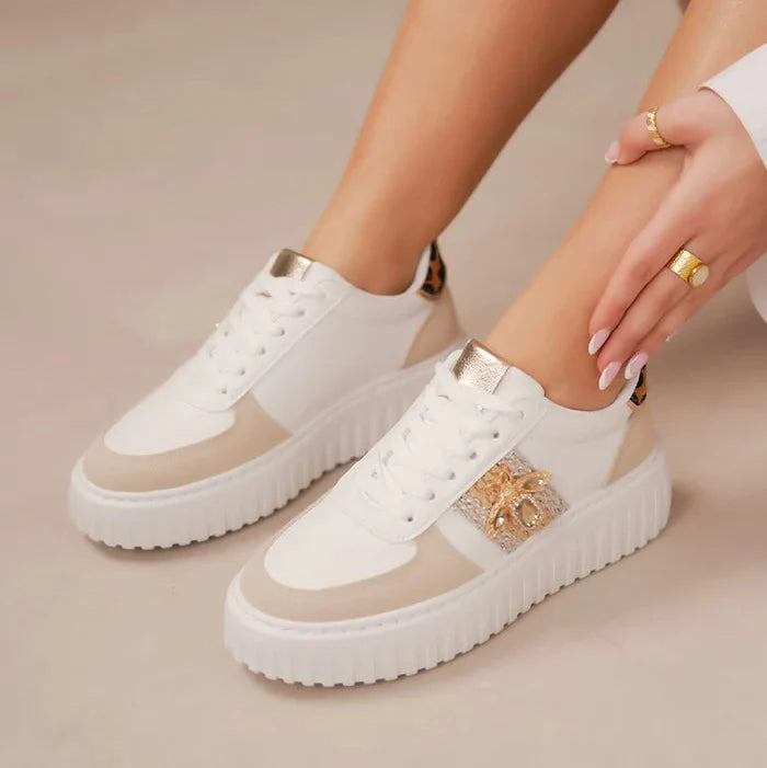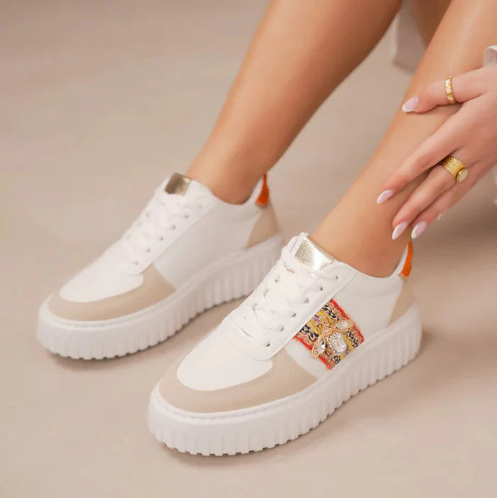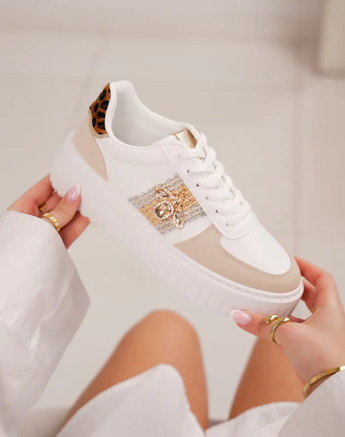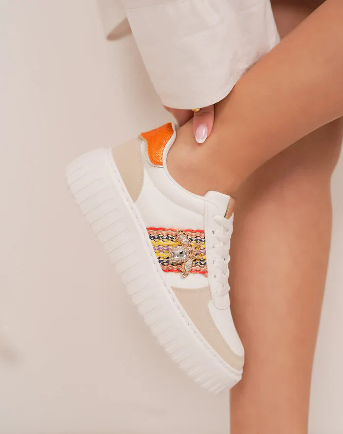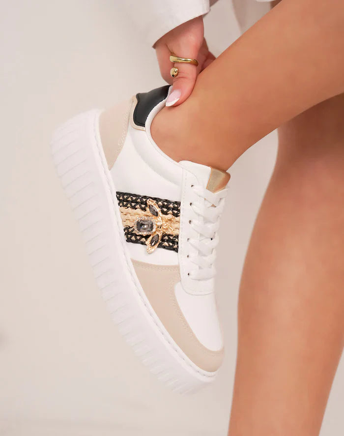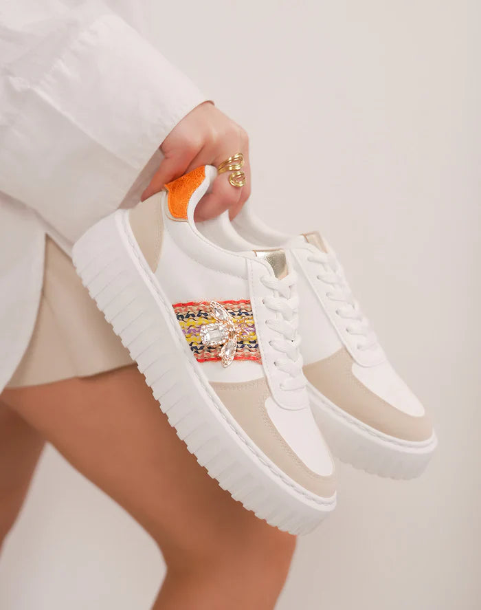 Craquez pour l’originalité avec ces baskets femme à plateforme, subtilement relevées par un empiècement en osier tressé, une touche de suédine beige et un bijou doré en forme d’abeille incrusté de strass. L’arrière du modèle présente un patch imprimé pour une touche sauvage et audacieuse.