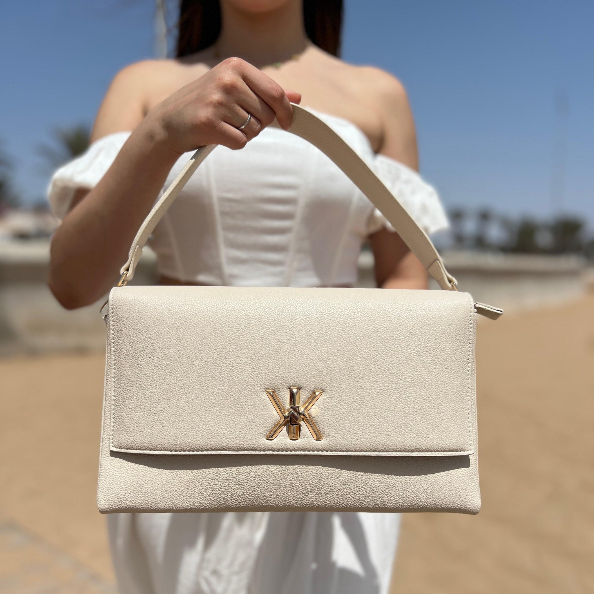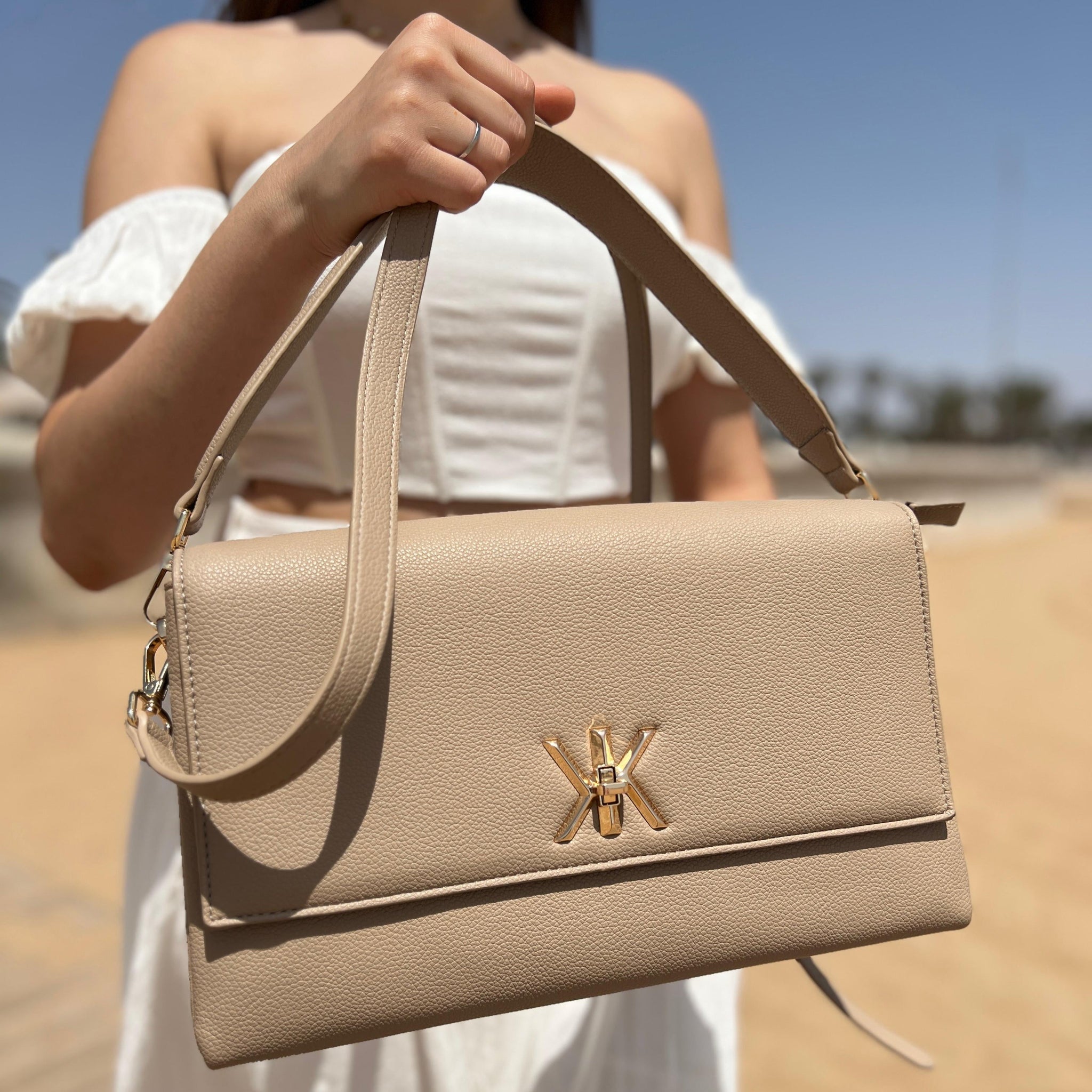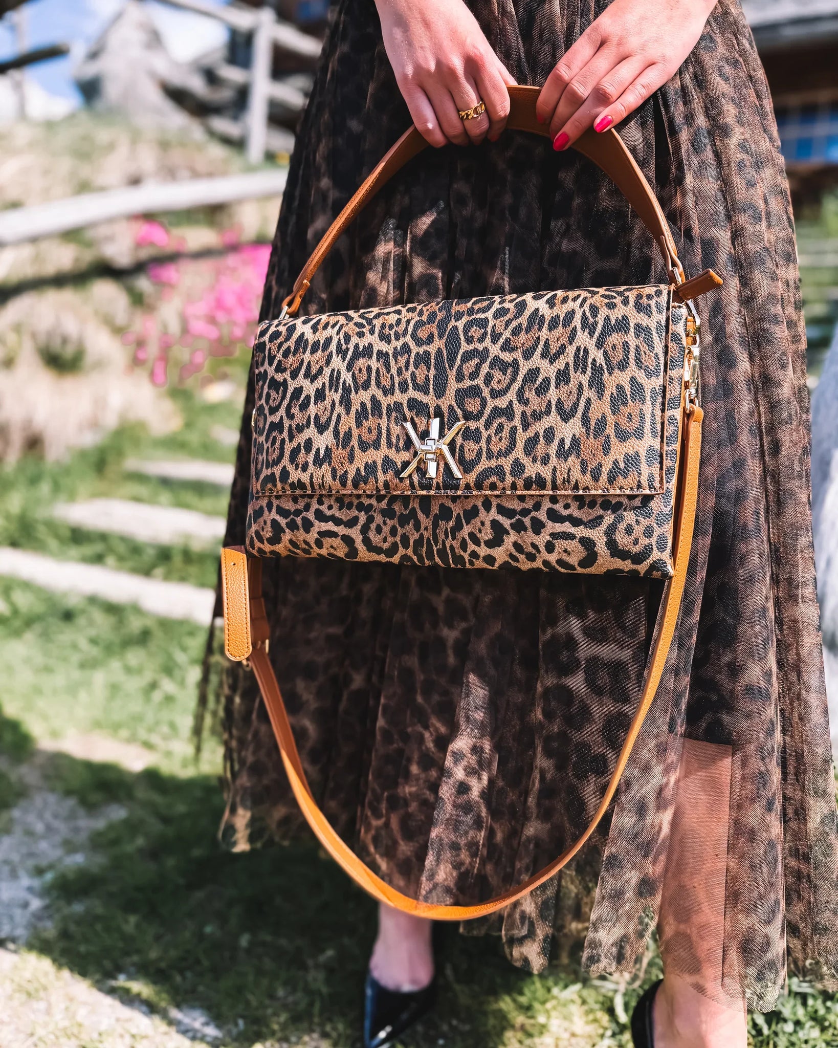 Pochette noire avec anse et bandoulière décorée de détails dorés