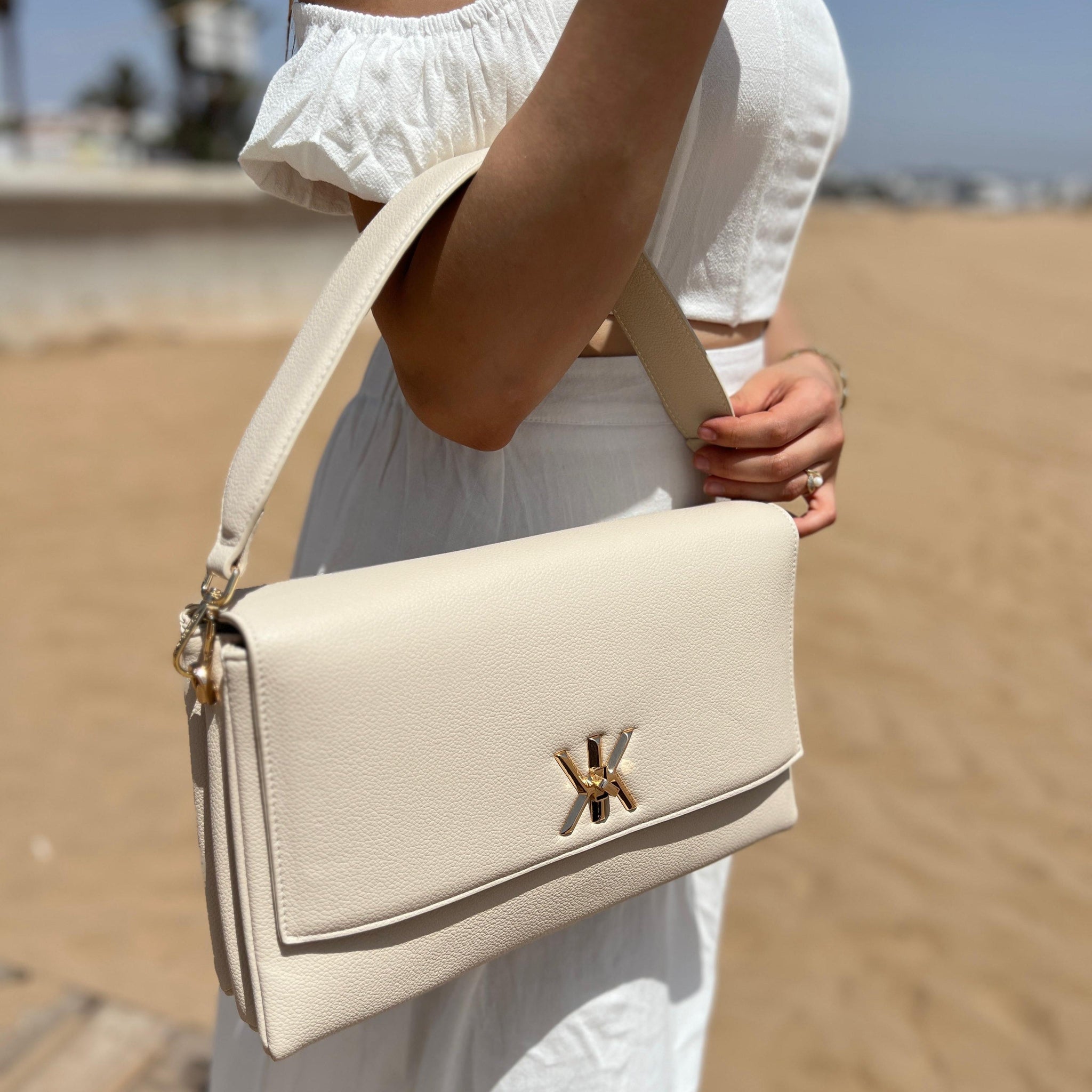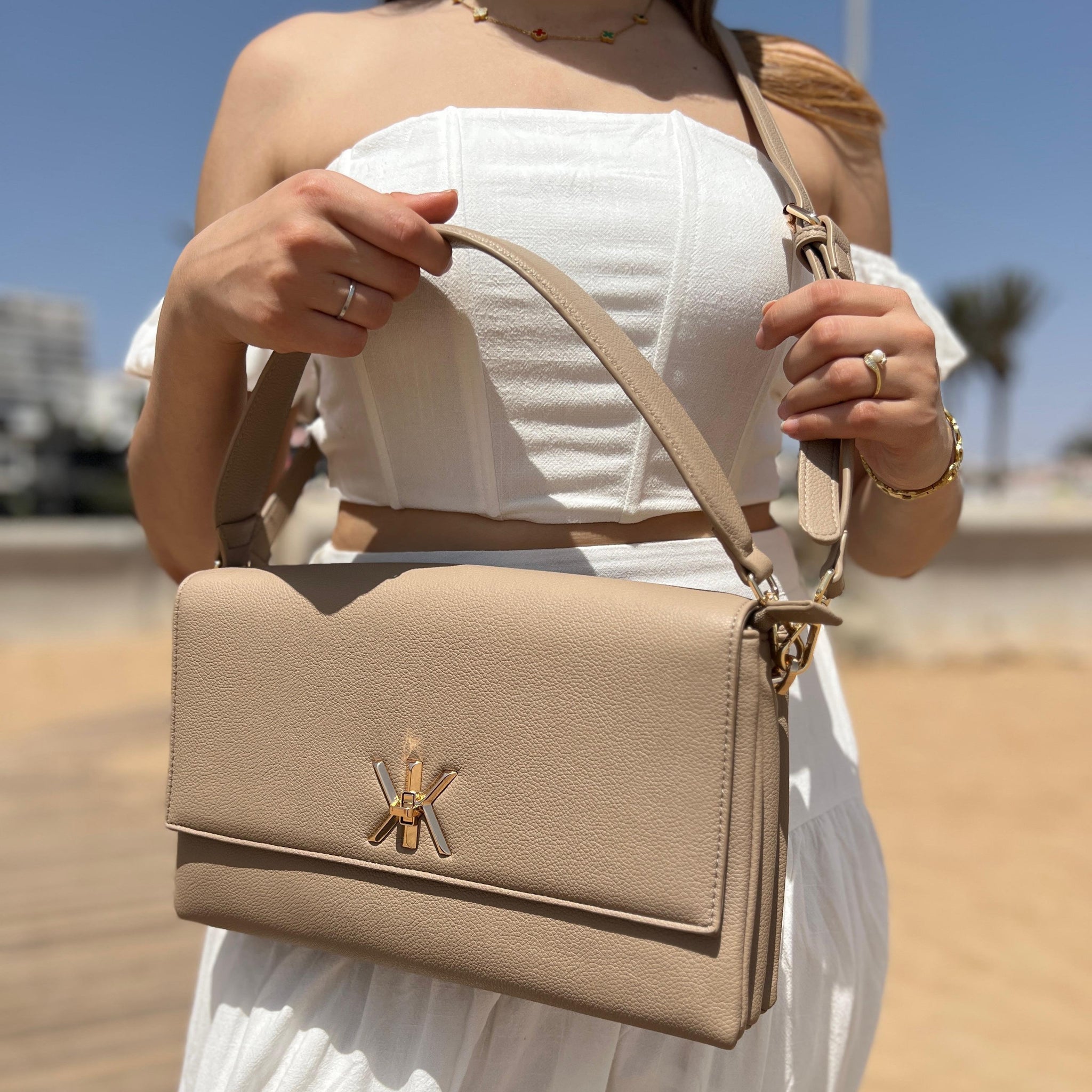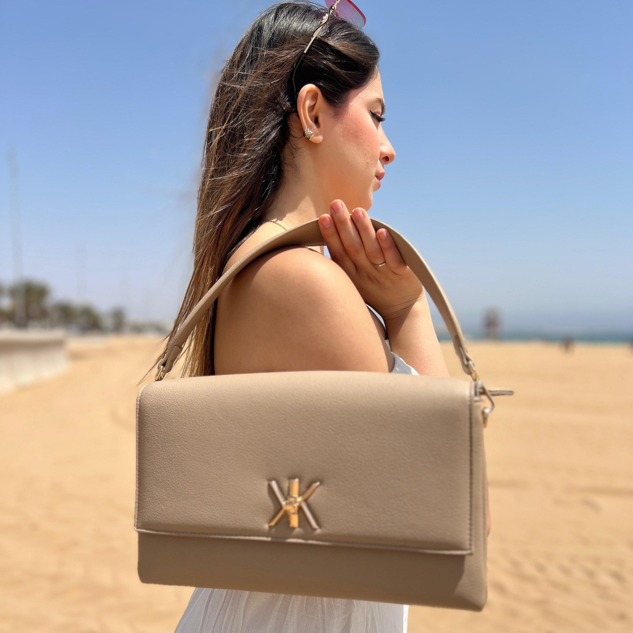 Pochette noire avec anse et bandoulière décorée de détails dorés